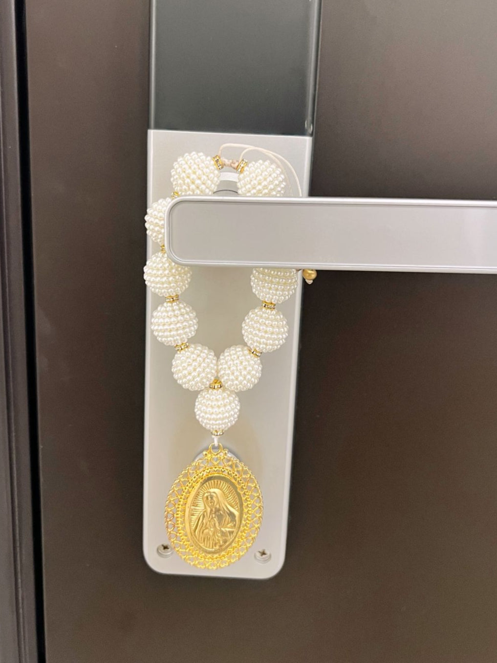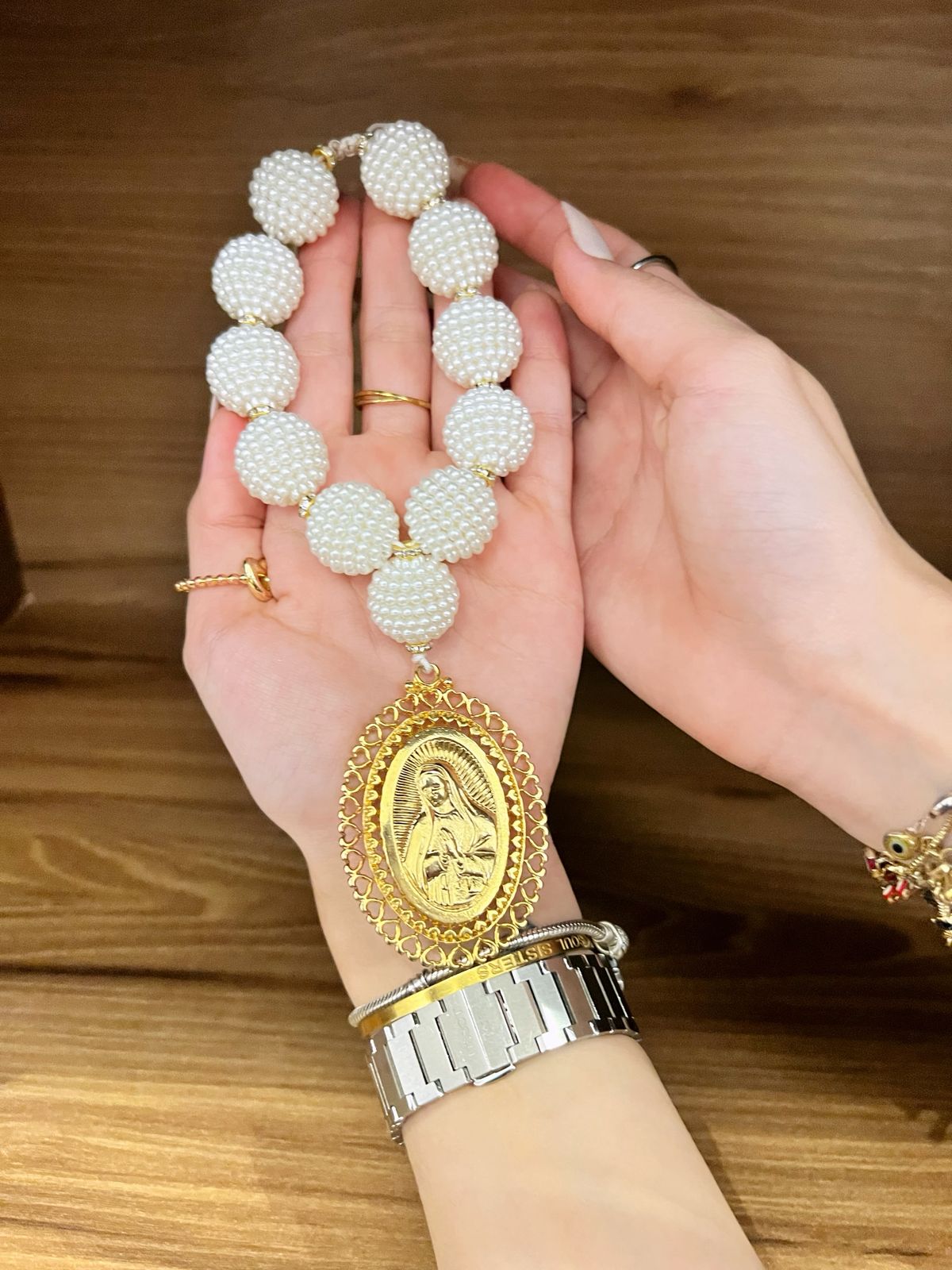 Un elegante decenario artesanal (ajustable) elaborado con cuentas grandes forradas en delicadas perlas blancas, símbolo de pureza y devoción. Los diferentes tipos de medallas añaden un toque especial y significativo, ideal para momentos de oración o como recuerdo para ocasiones religiosas como bautizos, primeras comuniones o confirmaciones.