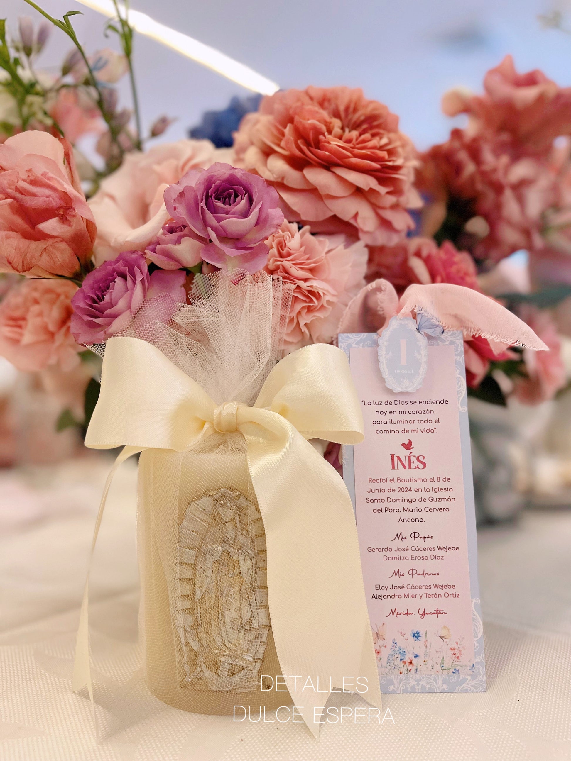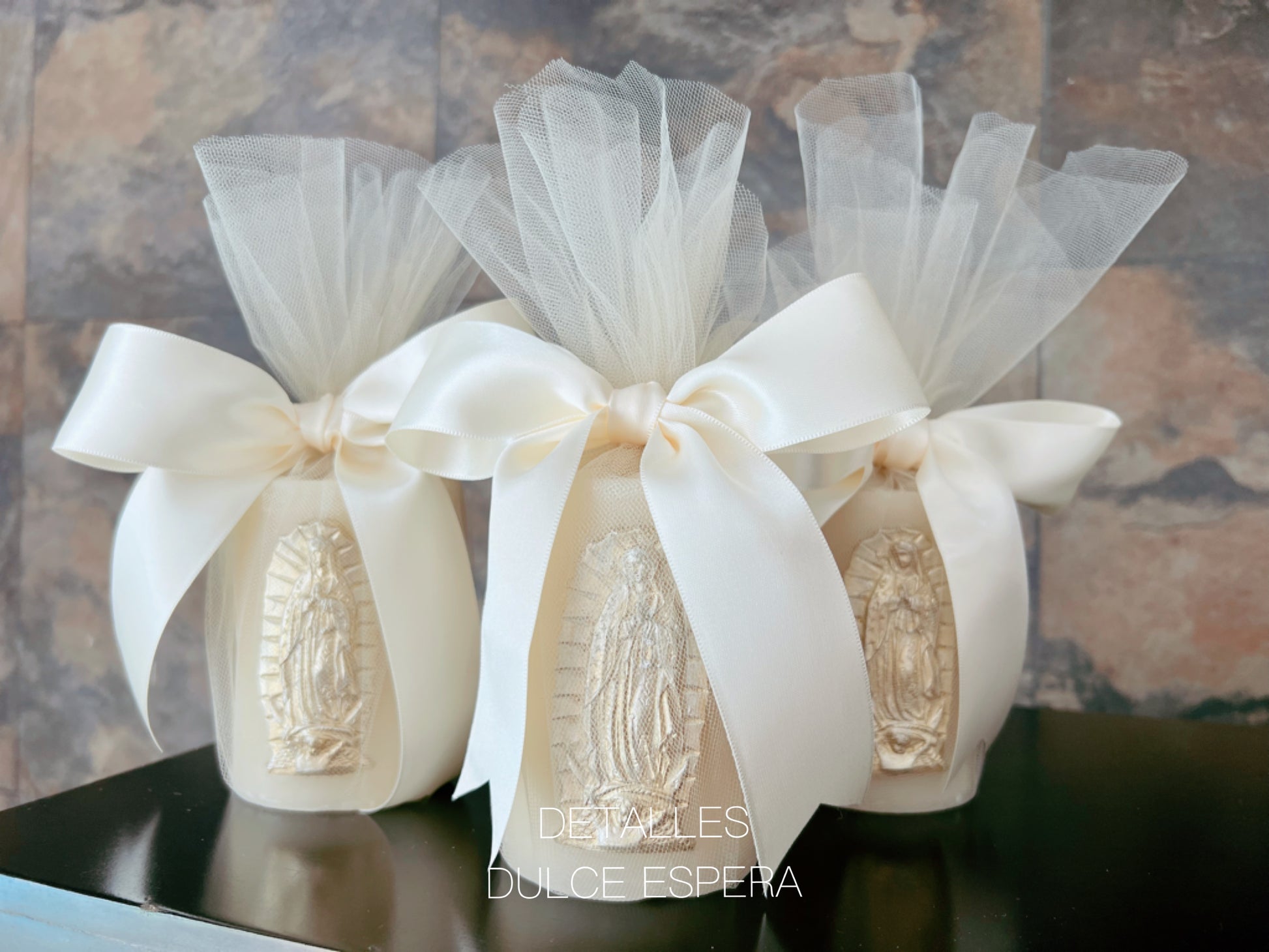Un divino cirio lleno de ternura y devoción, con la imagen dorada de Nuestra Señora de Guadalupe. Perfecto para bautizos, primeras comuniones, confirmaciones y celebraciones religiosas. Su elegante presentación lo convierte en un recuerdo inolvidable.