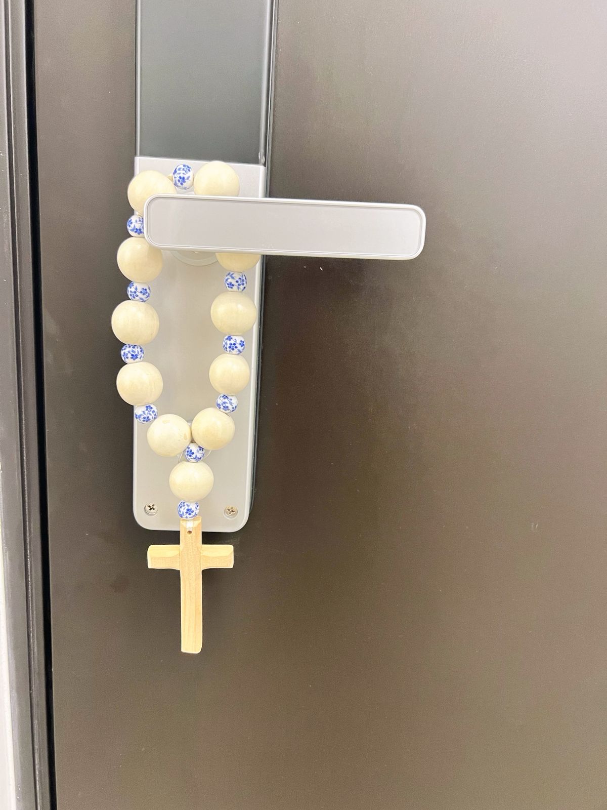Un decenario artesanal de gran tamaño, elaborado con cuentas de madera en tono marfil y delicados detalles pintados a mano en azul cobalto. Su cruz de madera natural aporta un estilo sencillo y elegante, ideal para colocar en puertas, paredes o espacios de oración en el hogar.