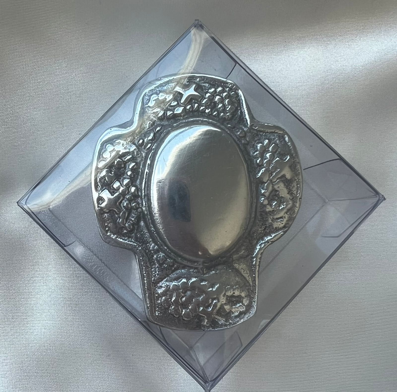Elegante porta rosario en forma de cruz, elaborado en pewter con un diseño único y refinado. Perfecto para llevar tu rosario de manera segura y con estilo. Se entrega en el empaque de tu elección, ideal para obsequios religiosos y momentos especiales. Pedido mínimo de 10 piezas.