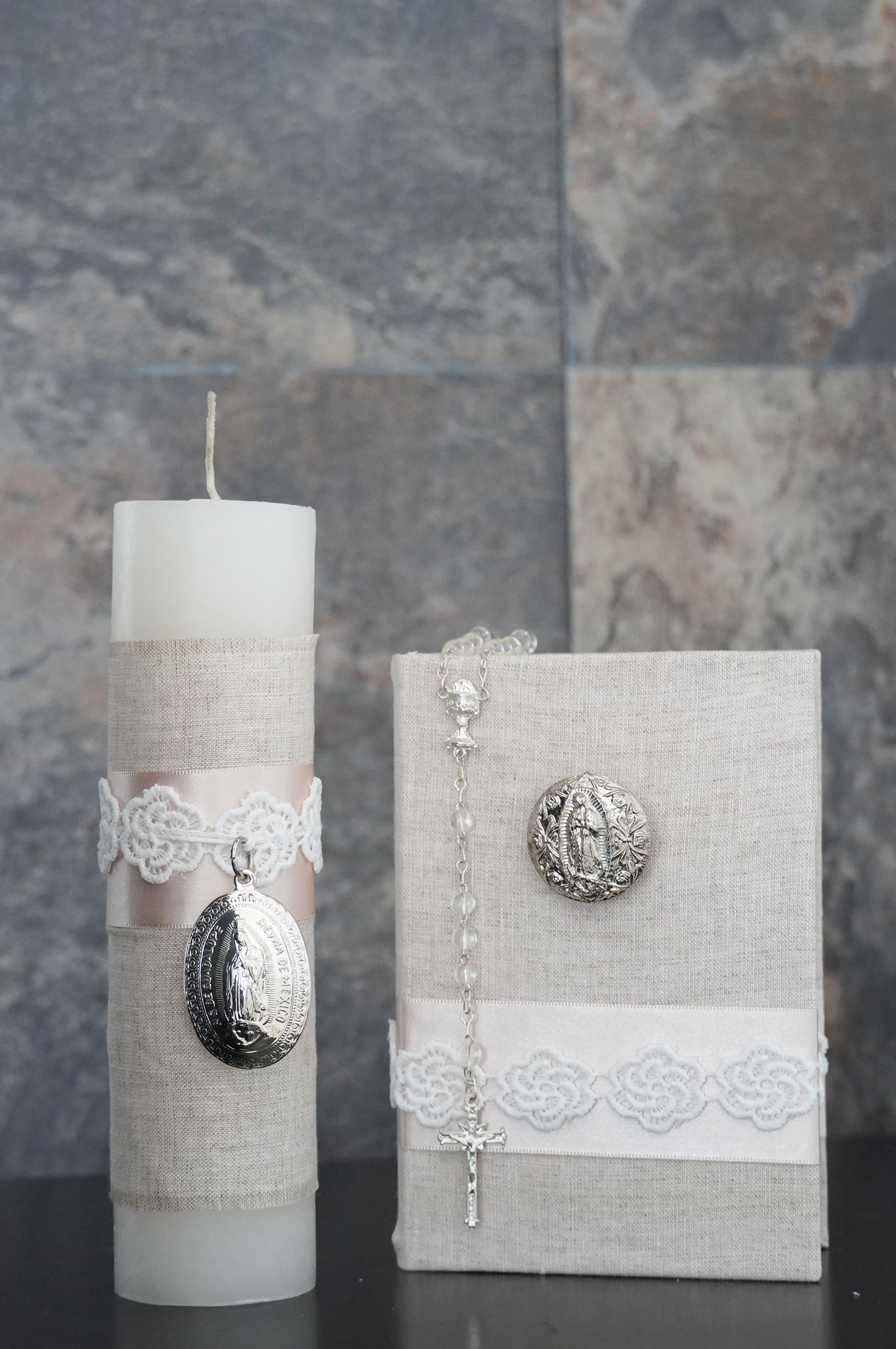 Este elegante kit de Primera Comunión incluye una Biblia, una vela y un rosario, todos decorados con lino beige, listón importado color beige y un hermoso bordado floral. La medalla de la Virgen de Guadalupe de 5 cm aporta un toque especial: la de la vela está elaborada en baño de plata y la de la Biblia en latón.