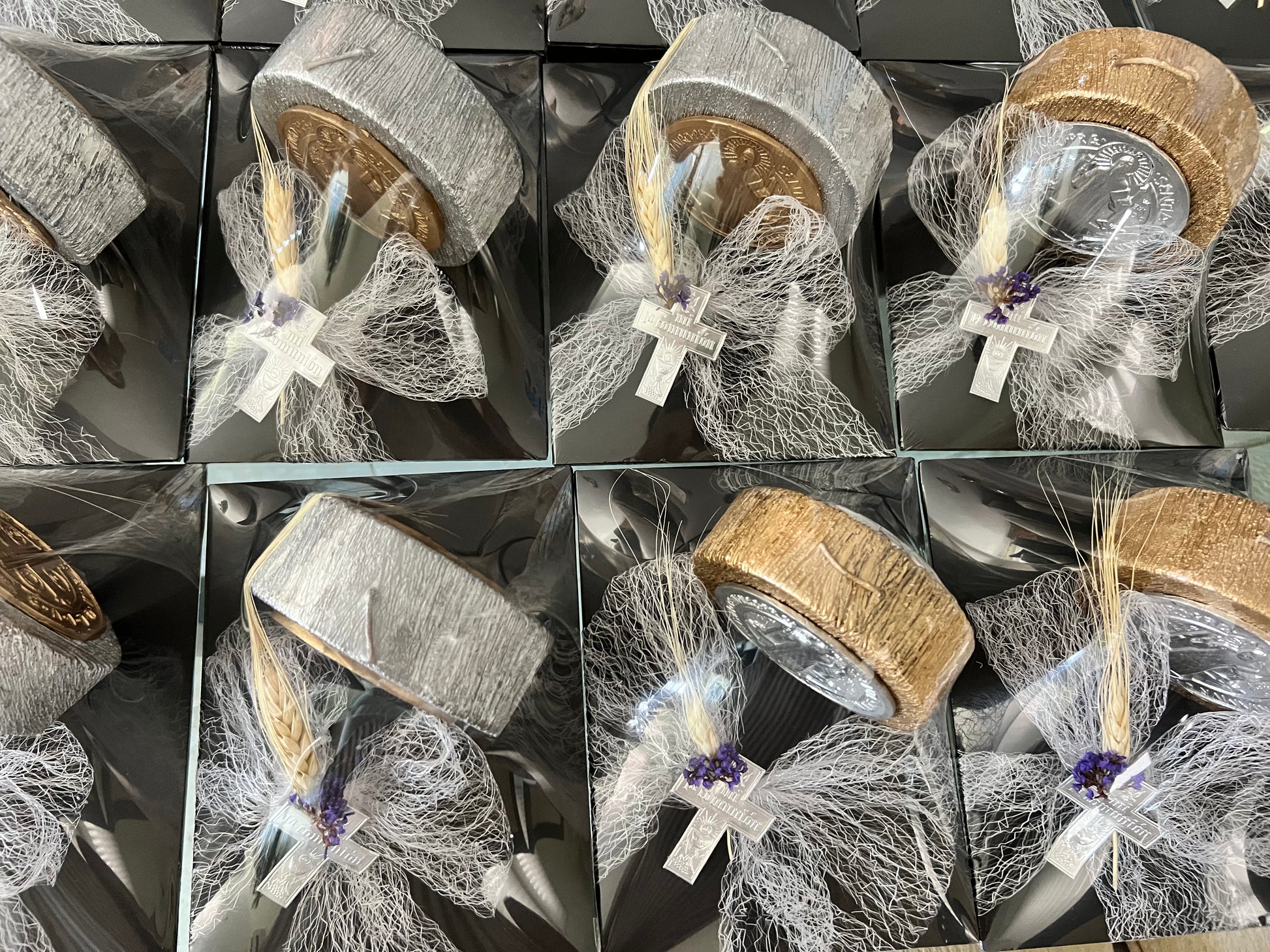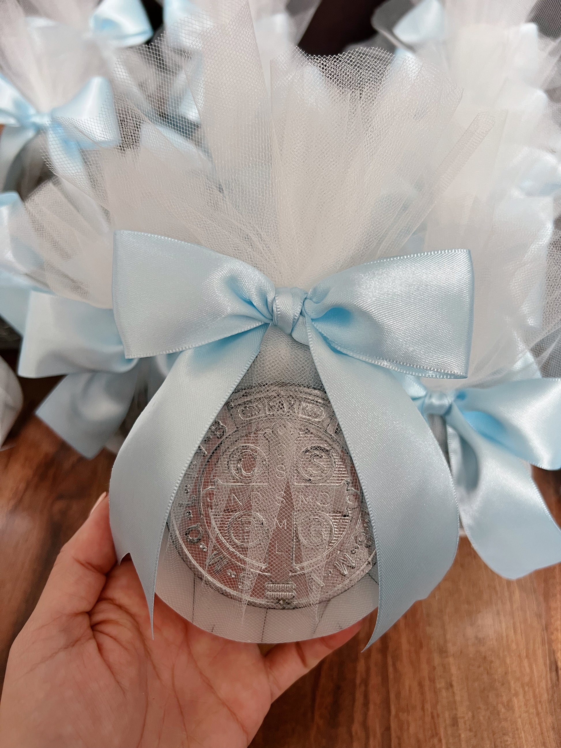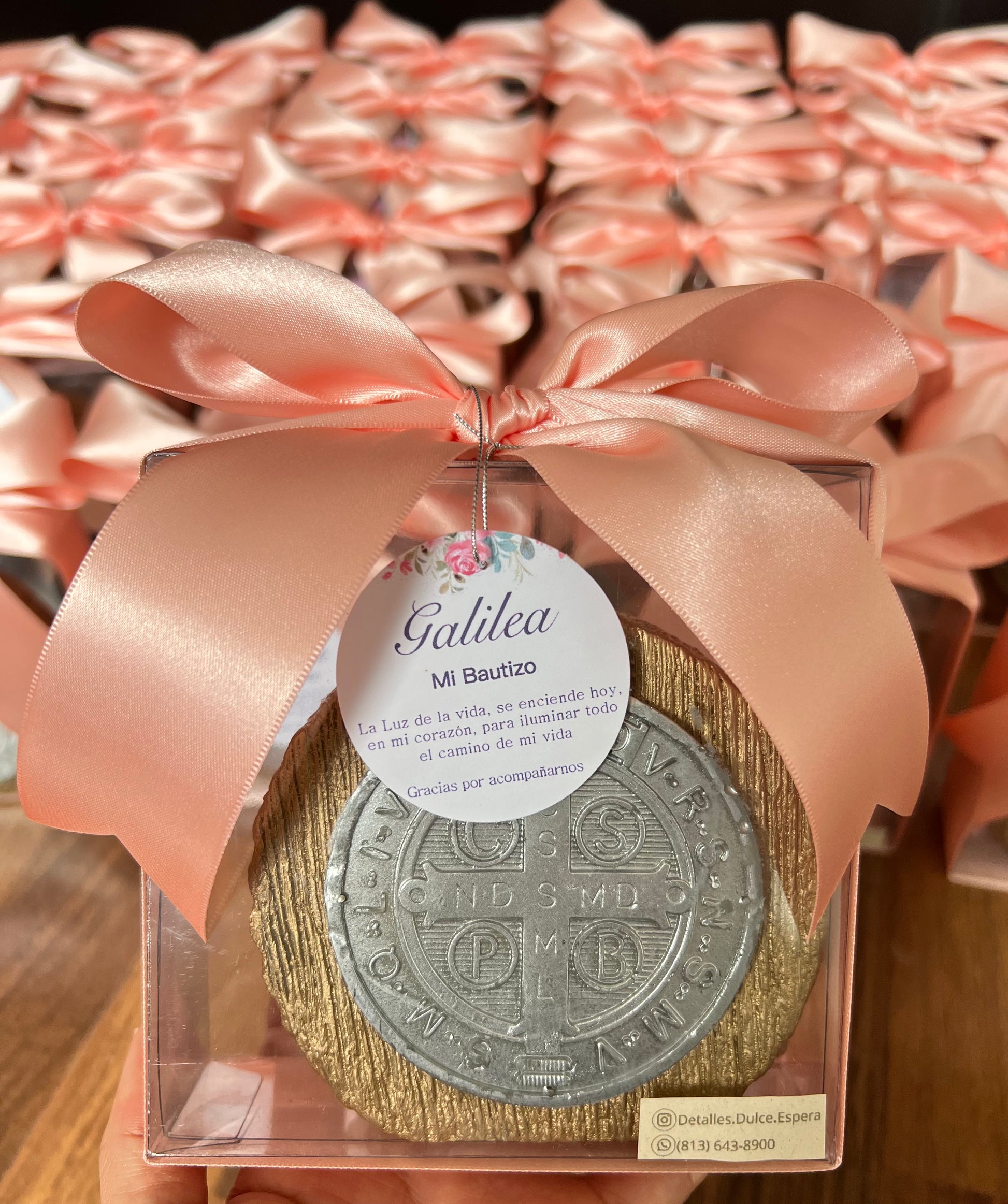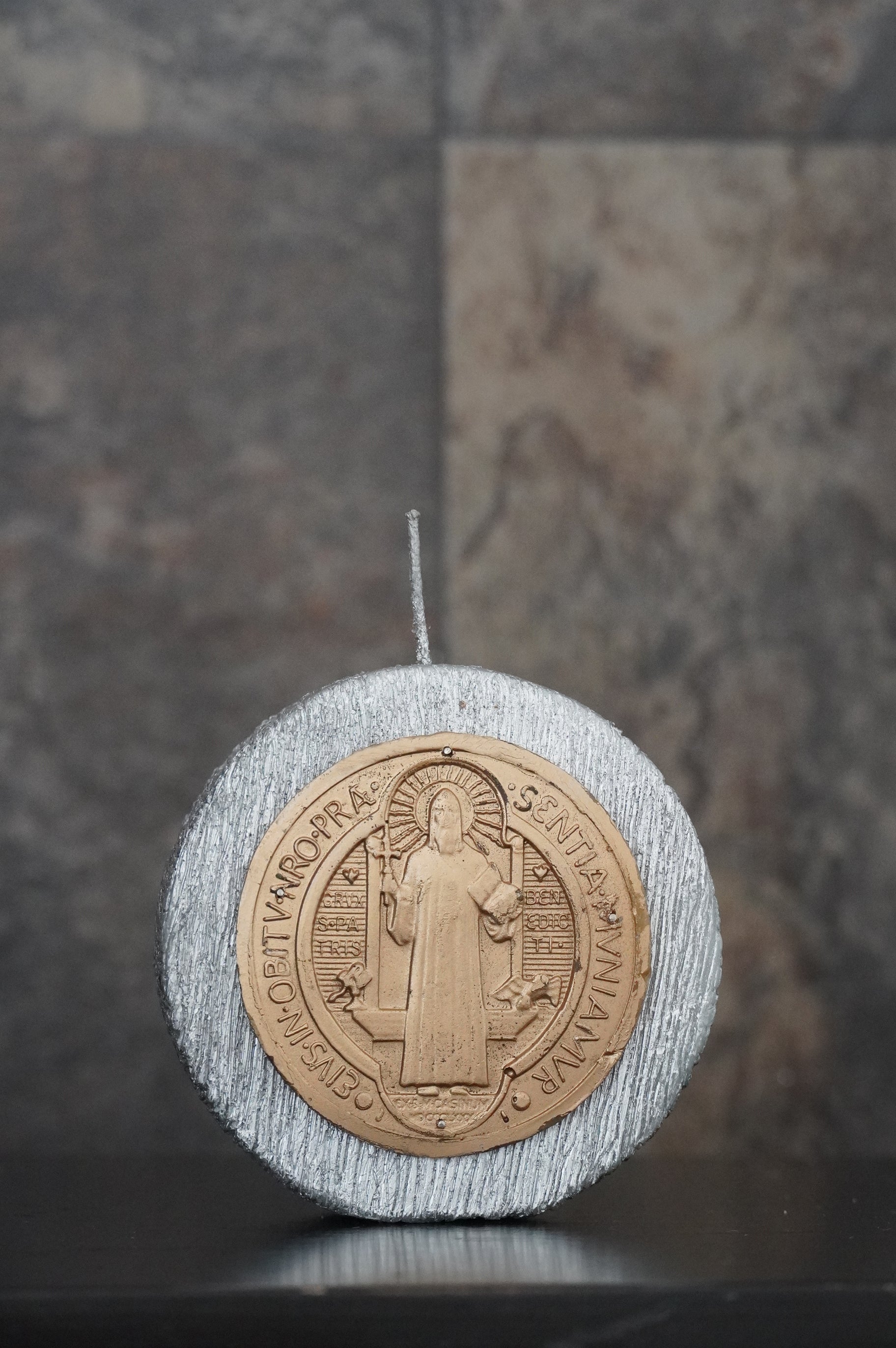 Hermosa vela en forma de medallón de San Benito, con detalles en ambas caras: la imagen de San Benito y la Medalla de la Santa Cruz. Un símbolo de bendición y resguardo, ideal como recuerdo para bautizos, primeras comuniones, confirmaciones y otras celebraciones religiosas.