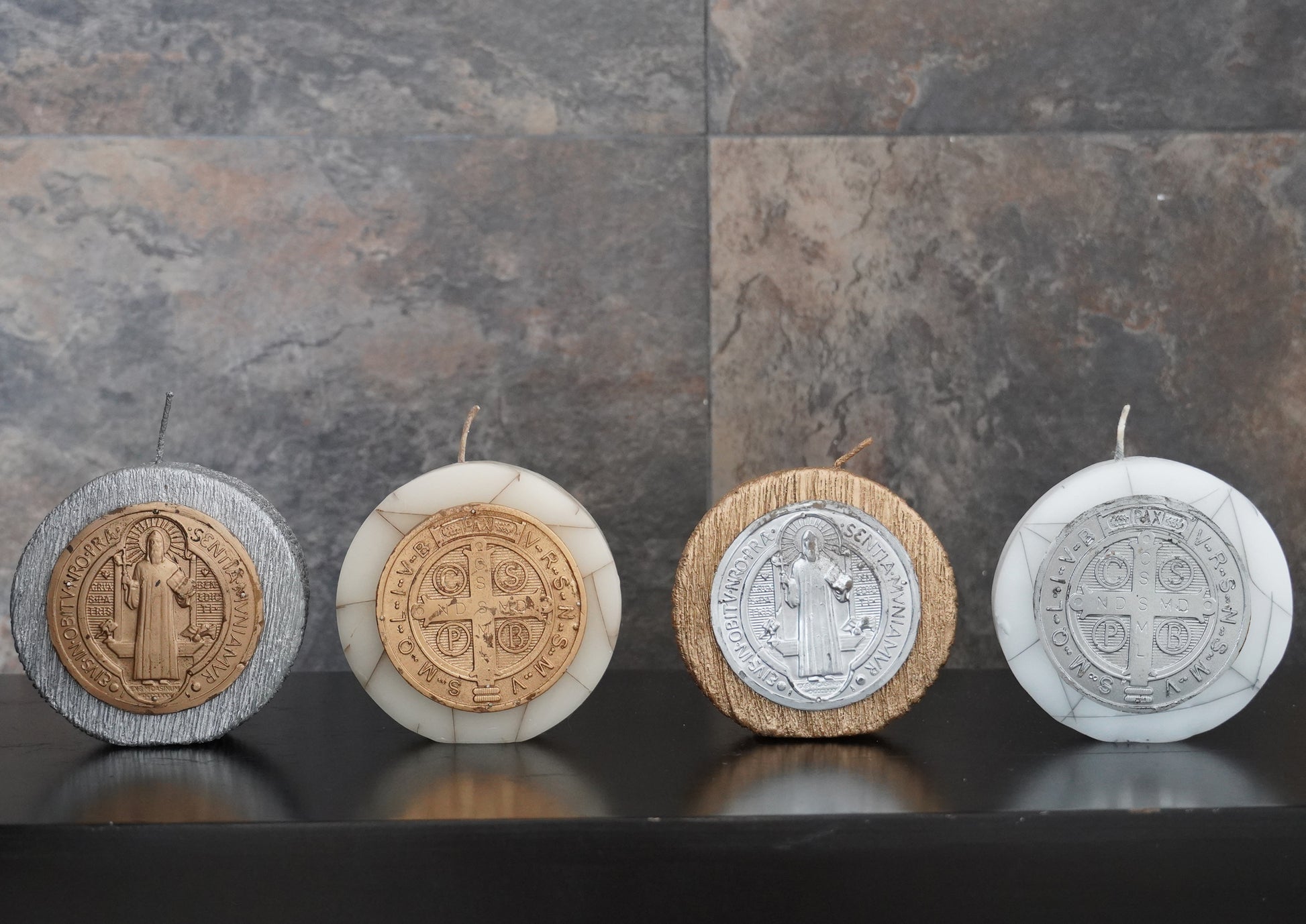 ✔ Vela en forma de medallón con ambas caras: San Benito y Medalla de la Santa Cruz